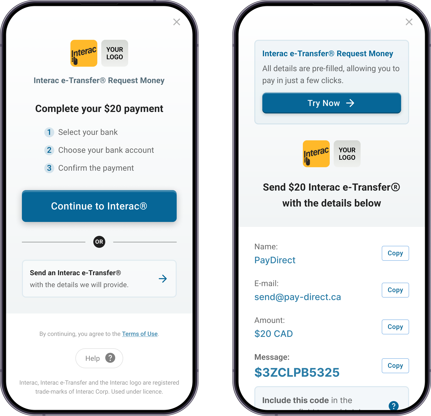 You can upload your logo and co-brand the payment experience. Your logo will be displayed next to the Interac Logo.