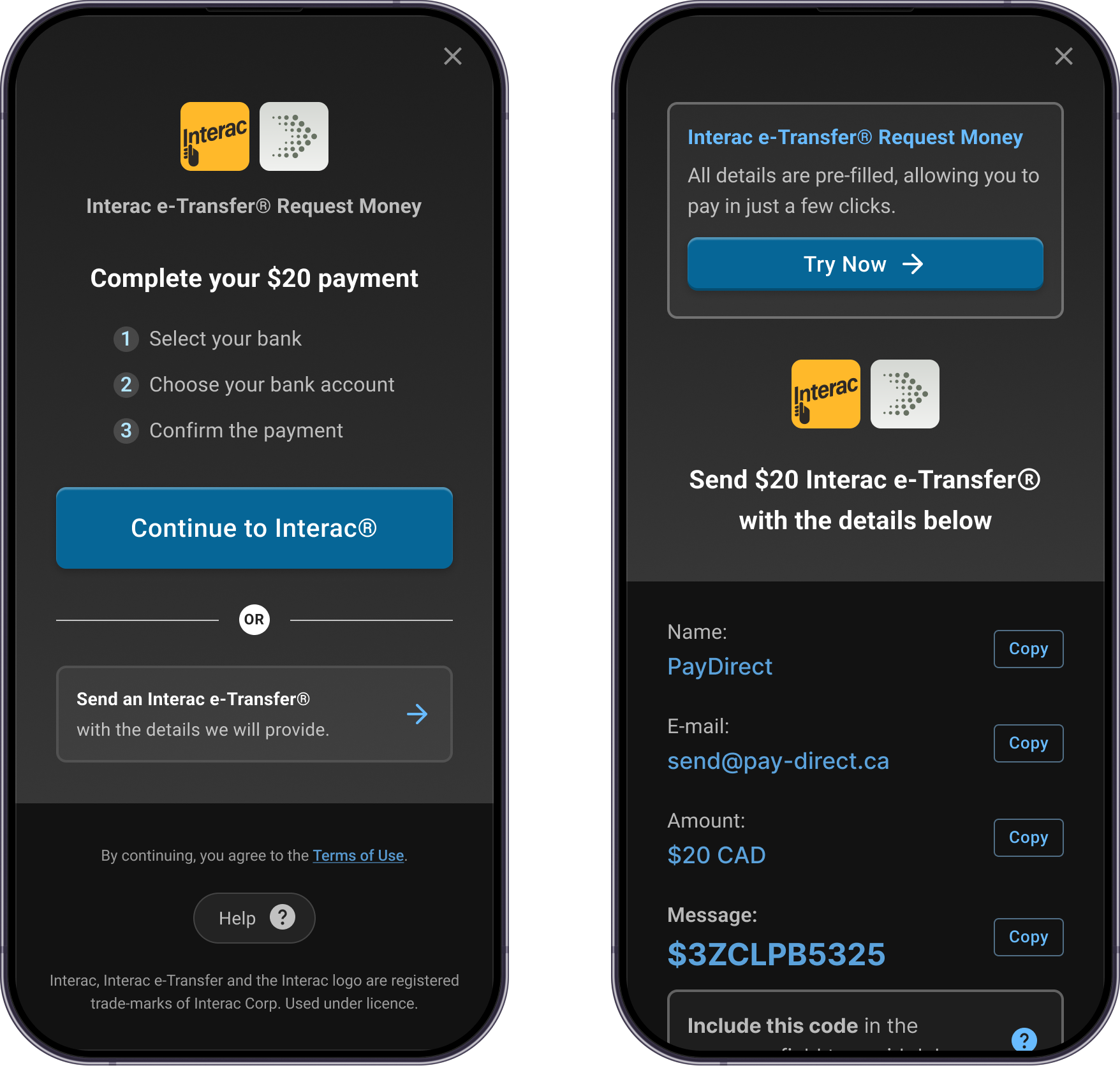 Paramount Commerce offers various customization options for the INTERAC payment flow, allowing you to create a branded user journey tailored to your company. You can customize your payment flow by accessing the Paramount Commerce Merchant Portal.